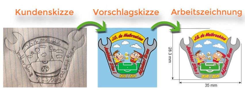 Sind Sie weniger geschickt mit dem Computer, dafür aber geschickter mit Ihren Händen? Skizzieren Sie uns Ihr Wunschabzeichen mit all Ihren Gestaltungswünschen. Machen Sie ein möglichst klares Bild, oder scannen Sie es ein und senden Sie es an info@pro-merchandise.de, oder fügen Sie es dem Antragsformular an. Wir werden die Skizze Ihres Emblems weiter ausarbeiten. Sie erhalten von uns eine digitale Arbeitszeichnung Ihres Emblems zwecks Prüfung und das alles unverbindlich. Ein Auftrag kommt erst mit Ihrer ausdrücklichen Freigabe des Entwurfs zustande. Die Abbildung unten ist ein Beispiel für eine Skizze und die Arbeitszeichnung eines Emblems.