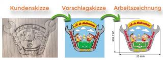 Die erste Möglichkeit ist sehr einfach, denn Sie stellen den Entwurf zur Verfügung. Mit Ihren Grafikdesign-Kenntnissen (oder denen eines Kollegen/Freundes/Bekannten) ist Ihr Entwurf einsatzbereit. Wir werden dann nur noch die Feinabstimmung vornehmen und eine Arbeitszeichnung Ihres Emblems anfertigen. Das finale Ergebnis wird Ihnen zur Freigabe zugesandt. Sind Sie vollkommen einverstanden? Erst dann geht ihr Auftrag in Arbeit und Ihr einzigartiges Emblem wird angefertigt.
